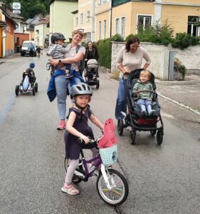 Parents navigating Ebensee’s streets with strollers and young children face constant challenges: dodging cars, maneuvering through narrow or bumpy sidewalks, and feeling threatened by excessive driving speeds. These daily struggles highlight how current street design fails the most vulnerable road users: children and their caregivers. That’s why we organized a stroller march in July of 2025.