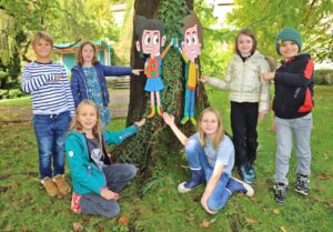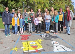 The path via the Dienerstiege to school is decorated with colorful pennants painted by children during the June school festival, while students from the fashion school spray-painted a vibrant graffiti mural at the parent drop-off zone entrance to Rathauspark.